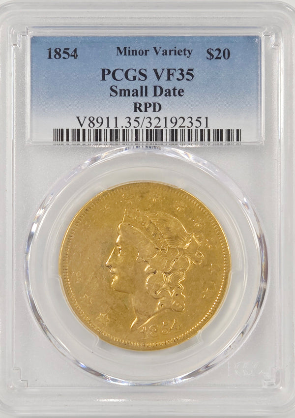 1854 Small Date RPD $20 Gold Liberty Minor Variety PCGS VF35