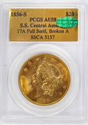 1856-S $20 Gold Liberty S.S. Central America 17A Full Serif, Broken A PCGS AU58 CAC