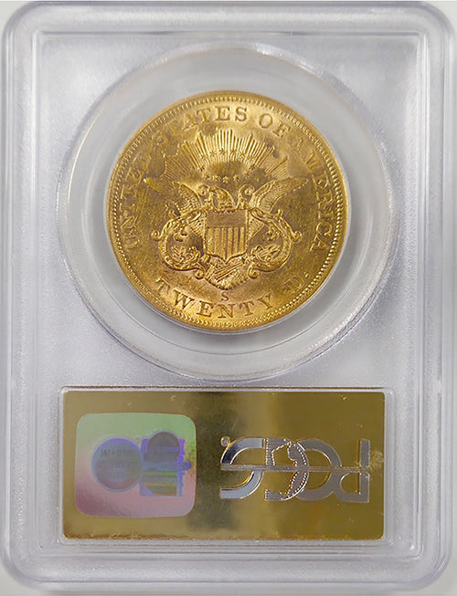 1855-S $20 Gold S.S. Central America 14C S Tilted Right PCGS AU53 CAC SSCA 6382