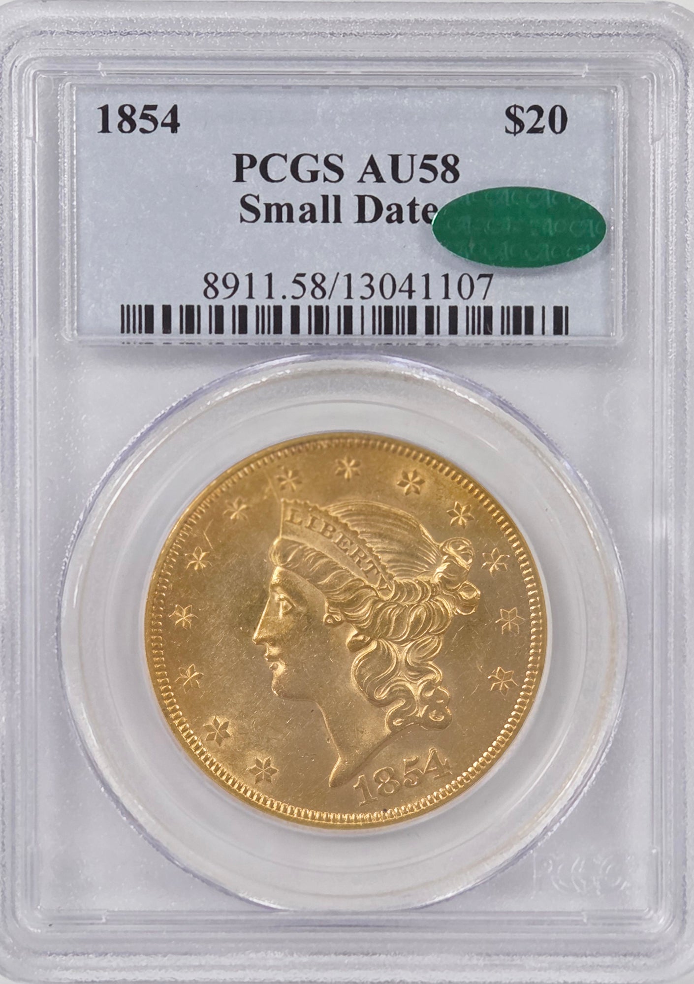 1854 $20 Gold Liberty Small Date PCGS AU58 CAC