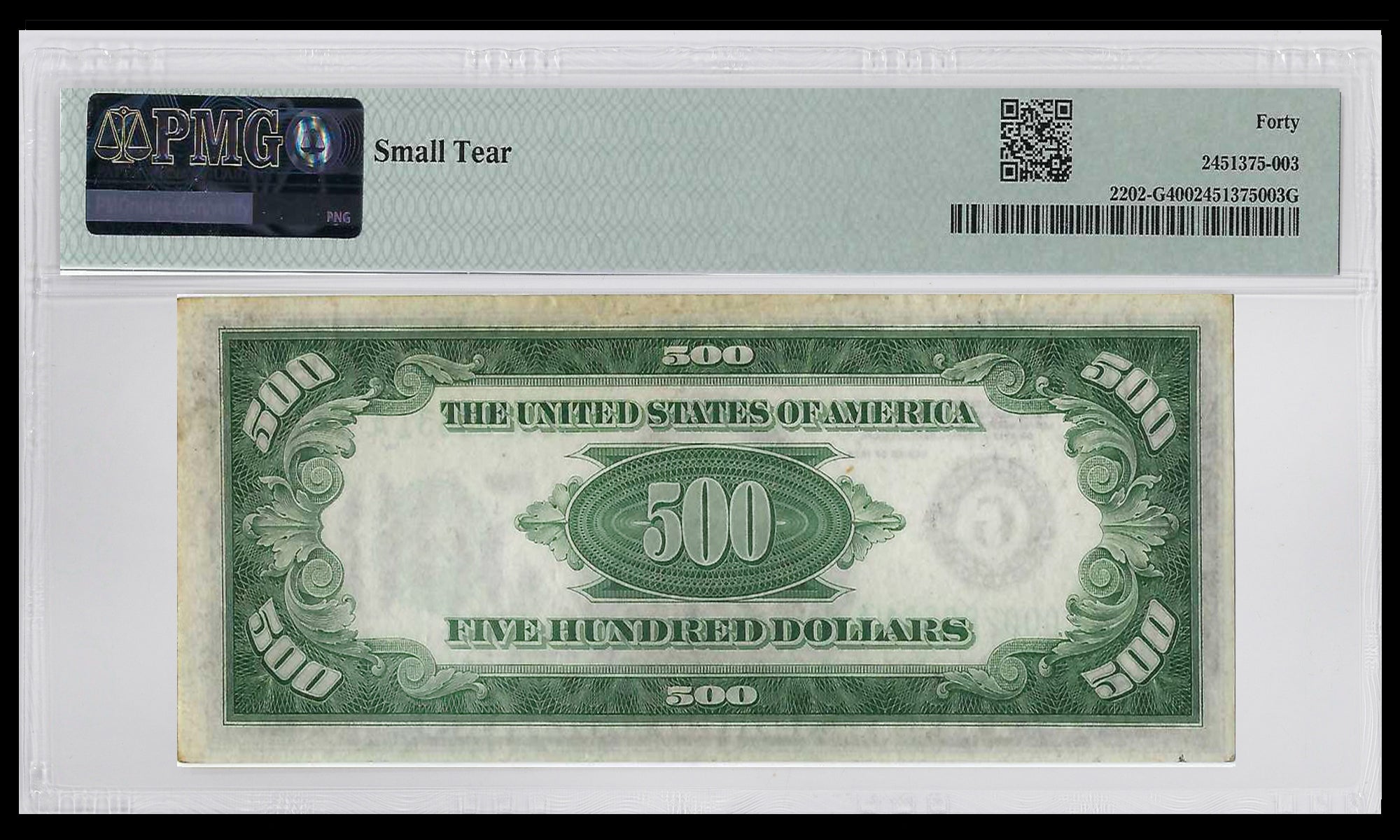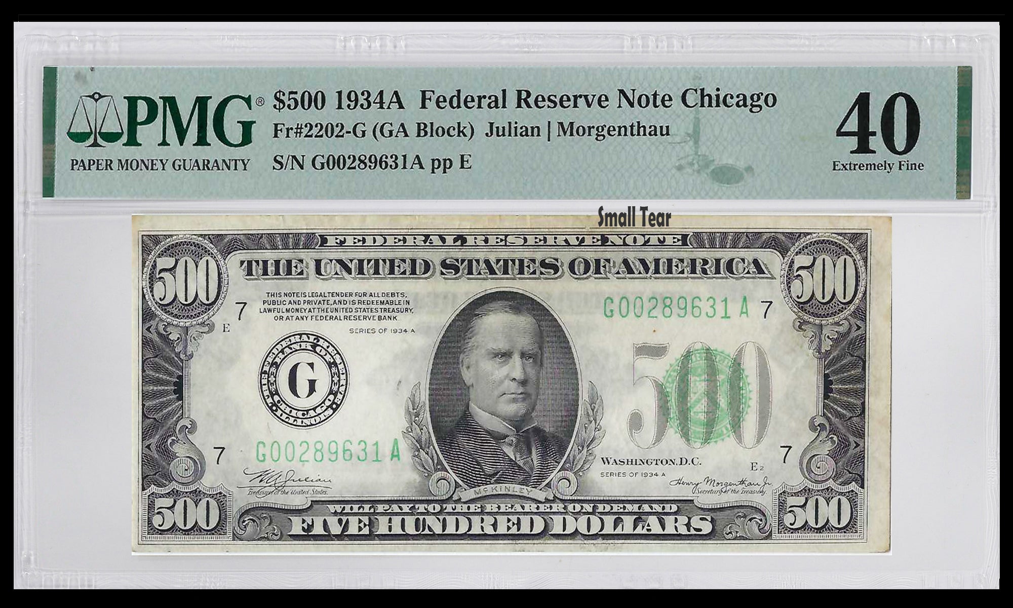 Series 1934A $500 Federal Reserve Note Chicago Fr.2202-G PMG XF40 Small Tear